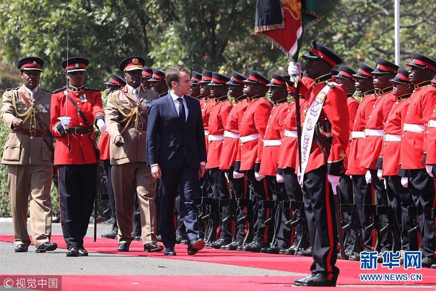 法国总统马克龙访问肯尼亚 出席仪仗队检阅仪式