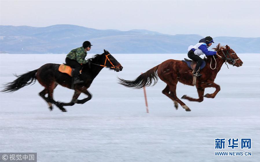 俄罗斯举办冰上赛马比赛 赛手展示高超骑术