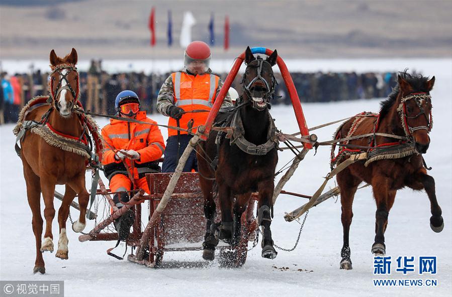 当地时间2019年3月16日,俄罗斯克拉斯诺雅茨克,年度业余冰上赛马比赛在被冰雪覆盖的叶尼塞河上举行。 (图片来源:视觉中国)