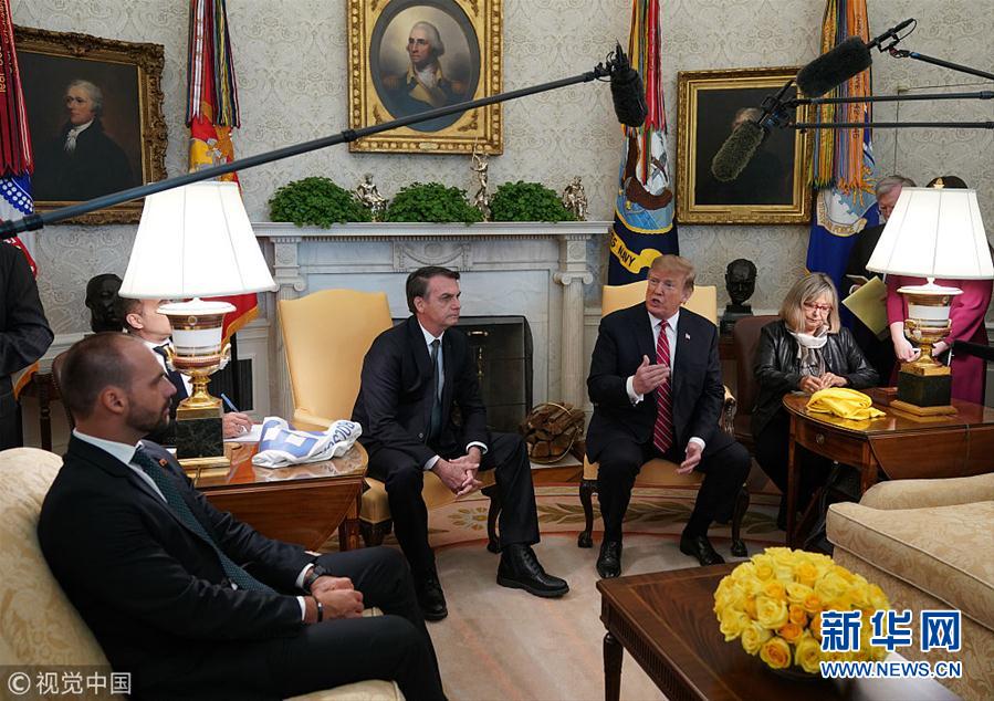 当地时间2019年3月19日,美国华盛顿,美国总统唐纳德·特朗普与巴西总统博尔索纳罗在白宫出席联合新闻发布会。(图片来源:视觉中国)
