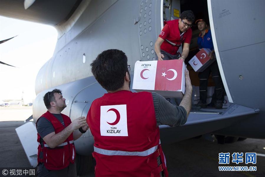 当地时间2019年3月24日,莫桑比克贝拉,莫桑比克遭强热带气旋“伊代”袭击,土耳其援助机构提供的人道主义援助抵达该地。莫桑比克国土环境和农村发展部部长科雷亚24日说,强热带气旋“伊代”自14日晚登陆该国中部沿海地区以来已造成446人死亡,受灾人口超过53万。(图片来源:视觉中国)