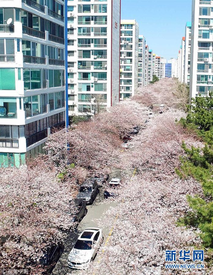当地时间2019年3月24日,韩国釜山水营区南川洞樱花街的樱花提前绽放,引游客观赏。(图片来源:视觉中国)