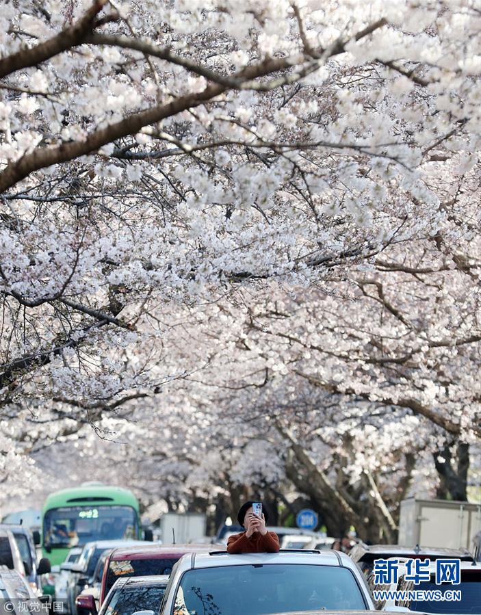 当地时间2019年3月24日,韩国釜山水营区南川洞樱花街的樱花提前绽放,引游客观赏。(图片来源:视觉中国)
