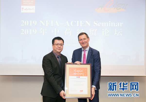 新华网海牙3月25日电(姜慧)荷兰国家外商投资局近日举办“2019年中荷经贸论坛”,并在活动上向全荷兰中资企业协会颁发“经贸使者奖”,以表彰该协会所代表的中资企业在荷兰的成功投资和对荷兰投资环境的认可,以及为荷兰经济作出的宝贵贡献。