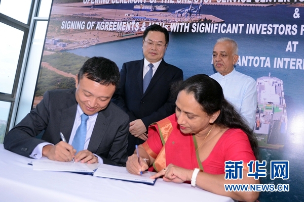 汉班托塔国际港口集团首席执行官任锐(左)与斯里兰卡投资局局长马拉高达签约。拉延·萨米拉 摄