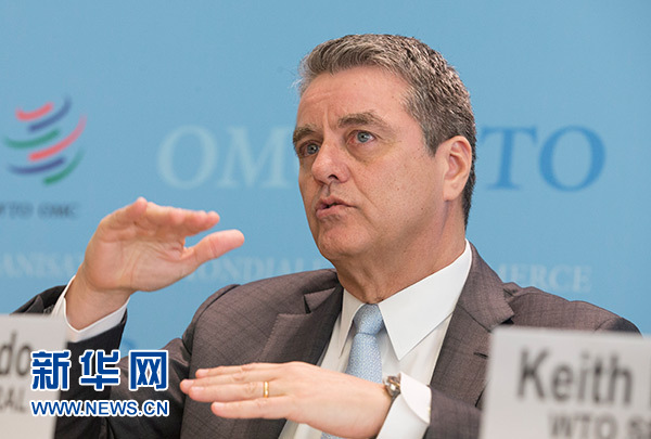4月2日,在瑞士日内瓦,世贸组织总干事阿泽维多出席记者会。 新华社记者 徐金泉 摄