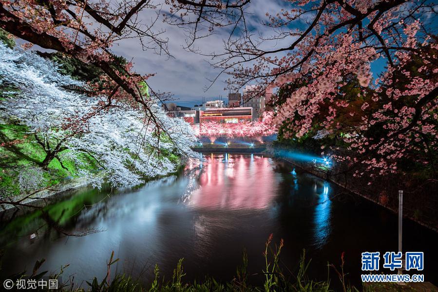当地时间2019年4月2日,日本东京,随着樱花的满开,东京千鸟渊于3月底至4月上旬夜间点灯举办梦幻的樱花祭活动。(图片来源:视觉中国)