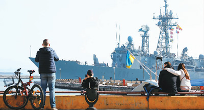 4月1日,北约两艘军舰抵达乌克兰南部港口城市敖德萨,开始进行为期3天的访问。图为人们在岸边观看军舰。新华社/路透
