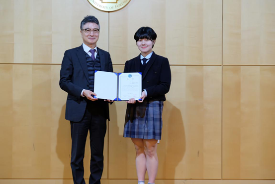 嘉宾为A组冠军朴贞恩(右)颁发获奖证书。(图片由韩国外国语大学孔子学院提供)