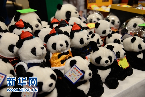 中国工艺品展台上摆放的熊猫玩偶。姜俏梅 摄