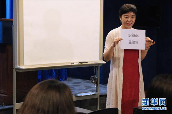 4月12日,在菲律宾马尼拉,菲律宾大学孔子学院的老师孟广洁为菲律宾总统府新闻部工作人员上课。新华社记者 郑昕 摄