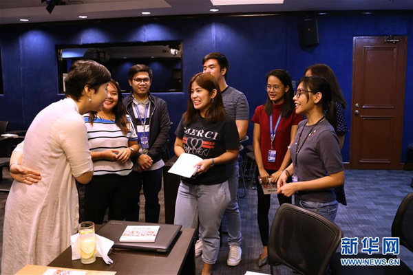 4月12日,在菲律宾马尼拉,菲律宾总统府新闻部工作人员向菲律宾大学孔子学院的老师孟广洁(左一)询问汉语学习的各种问题。新华社记者 袁梦晨 摄