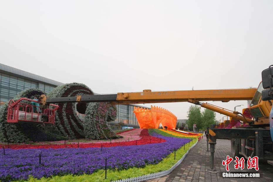 4月18日晚,北京奥林匹克公园内的“丝路金桥”主题景观点亮灯光,附属的花坛景观正在紧张施工。“丝路金桥”由中国艺术家舒勇创作,长28米、高6米、宽4米,是以“一带一路”倡议为语境的大型艺术作品,此次作为第二届“一带一路”国际合作高峰论坛的主题花坛亮相。中新社记者 贾天勇 摄