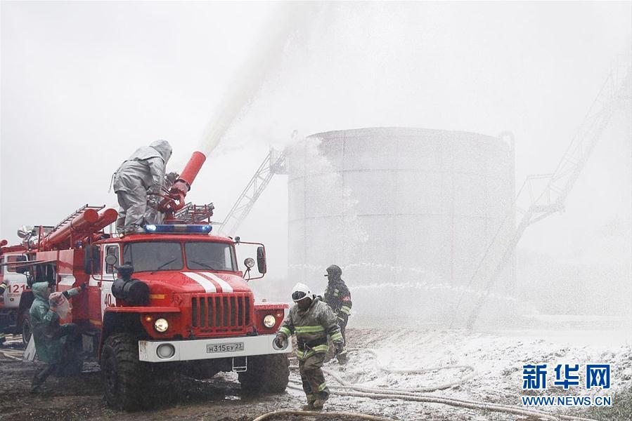 当地时间2019年4月19日,俄罗斯克拉斯诺达尔地区,消防队员参加模拟油罐起火的演习。(图片来源:视觉中国)