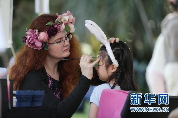 4月21日,在澳大利亚悉尼皇家植物园,小游客在寻找彩蛋活动中做脸部彩绘。新华社记者 白雪飞 摄