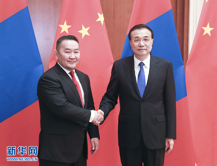 李克强表示,中蒙是山水相连的友好邻邦。今年适逢中蒙建交70周年和《中蒙友好合作关系条约》修订25周年,两国关系迎来新的发展机遇。习近平主席将同总统先生举行会谈,规划两国关系下一步发展。中方愿同蒙方加强政治互信,尊重彼此核心利益和重大关切,推动中蒙全面战略伙伴关系再上新台阶。我们愿在相互尊重、平等合作、互利互惠的基础上深化双方务实合作,将“一带一路”倡议同蒙方“发展之路”倡议对接,加快推进中蒙自贸协定和经济合作区,深化在农业、产能、人文等领域的交流合作,继续在边境运输、口岸建设等方面为蒙方提供便利。