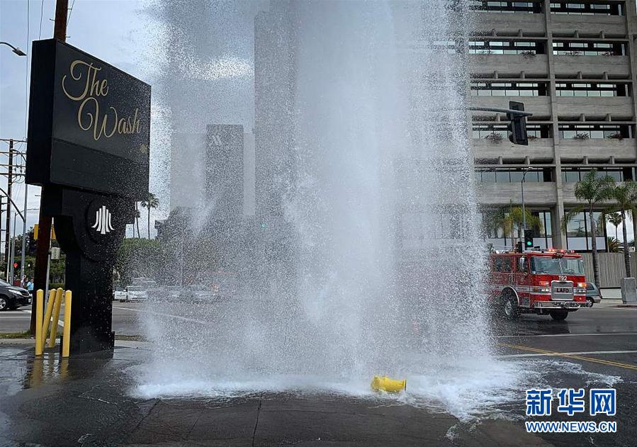 当地时间2019年4月29日,美国加州洛杉矶,在皮科大道,消防栓遭车撞断,水喷出如“瀑布”。(图片来源:视觉中国)