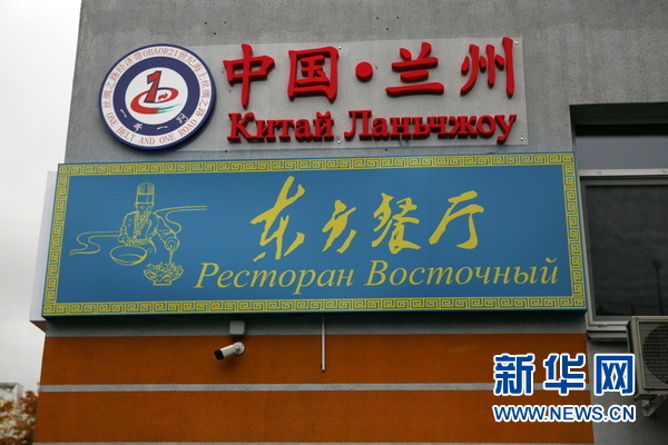 甘肃企业在白俄罗斯首都明斯克开设的主打兰州拉面的东方餐厅招牌。新华网记者 魏忠杰 摄