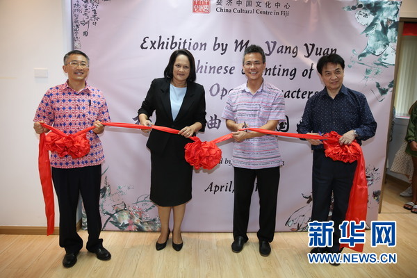 斐济中国文化中心主任邓先富(左一)、中国驻斐济大使馆临时代办黄学虎(右二)及斐济教育、文化遗产和艺术部长罗西·阿克巴尔(左二)等嘉宾为画展剪彩。新华网记者 张永兴 摄