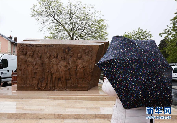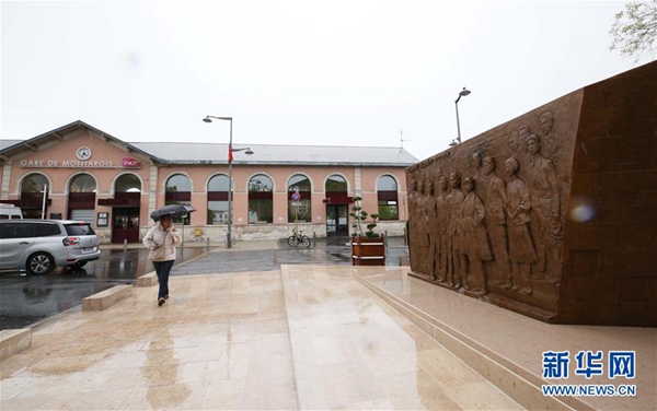 5月4日,在距法国巴黎100多公里的小城蒙塔日,《百年丰碑》大型雕塑被安放在火车站前的邓小平广场。新华社记者 高静 摄