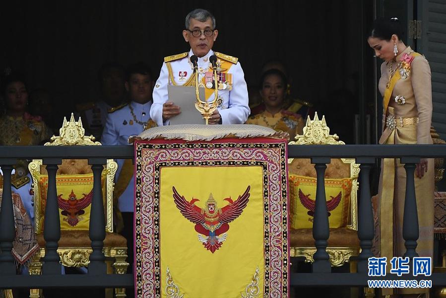 当地时间2019年5月6日,泰国曼谷,泰王哇集拉隆功现身大皇宫一阳台,接受民众美好祝福并发表讲话。(图片来源:视觉中国)