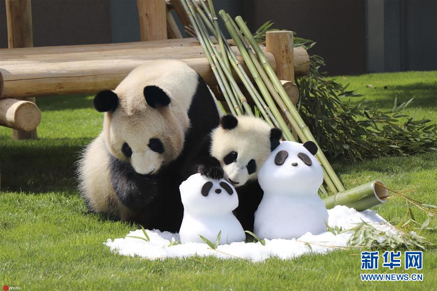 旅日大熊猫遇到“雪人熊猫”好奇不已爱不释手