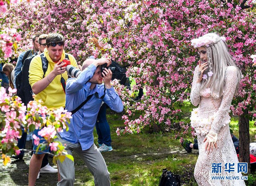 俄罗斯樱花烂漫 女游客争相拍艺术照