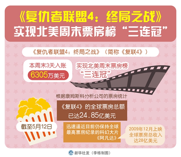 新华社洛杉矶5月12日电(记者高山)尽管面临强劲挑战,《复仇者联盟4:终局之战》(简称《复联4》)本周末依然凭借3天入账6305万美元,实现北美周末票房榜“三连冠”。
