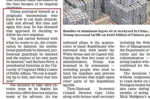 “他把自己描绘成一个务实的商人”,但是“他只是想做什么就做什么,宪法该死、制度该死、专业防护措施该死,”弗吉尼亚大学米勒公共事务中心的总统历史学家芭芭拉·佩里说:“他所在党派的领导人都很可恶,”“没有人站起来对抗他,他们现在害怕他。”