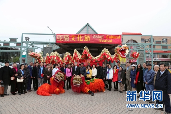受邀嘉宾与参加亚裔文化节的志愿者一同合影。新华社记者汪平 摄