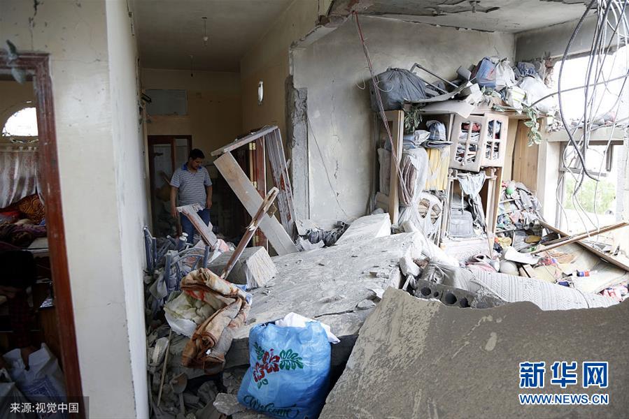 当地时间2019年5月16日,也门萨那,遭空袭后受损的房屋。也门胡塞武装16日说,沙特阿拉伯领导的多国联军当天对也门首都萨那实施密集空袭,造成至少6名平民死亡。(图片来源:视觉中国)