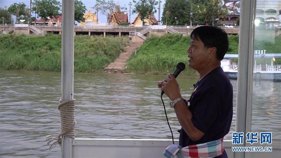 5月8日,在泰国那空拍侬府,那龙猜在湄公河游船上解说。58岁的那龙猜是泰国那空拍侬府湄公河游船上的志愿解说员。新华社记者郭鑫惠摄