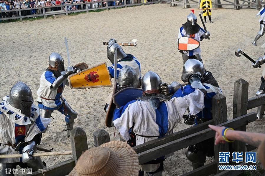 当地时间2019年5月18日,乌克兰基辅,这里举行为期四天的中世纪格斗(IMCF)世界锦标赛。来自法国、英国、德国、澳大利亚等国家的30支队伍来到乌克兰,利用根据中世纪时期样式打造的武器进行全甲格斗。(图片来源:视觉中国)