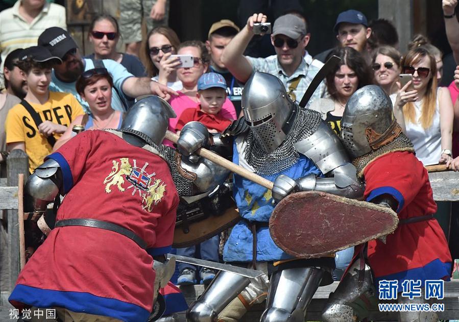 当地时间2019年5月18日,乌克兰基辅,这里举行为期四天的中世纪格斗(IMCF)世界锦标赛。来自法国、英国、德国、澳大利亚等国家的30支队伍来到乌克兰,利用根据中世纪时期样式打造的武器进行全甲格斗。(图片来源:视觉中国)