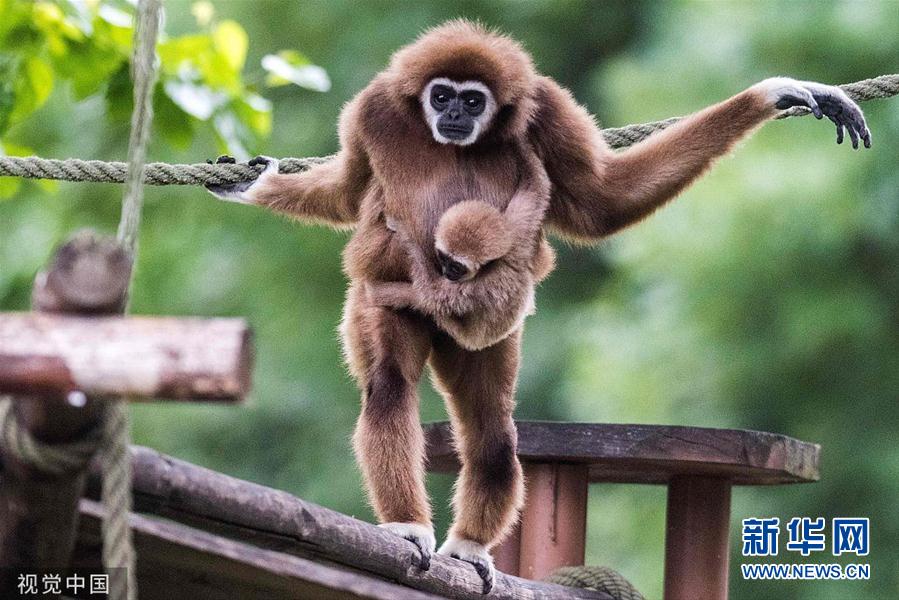 当地时间2019年5月20日,北马其顿斯科普里,当地动物园里的白掌长臂猿母子。(图片来源:视觉中国)