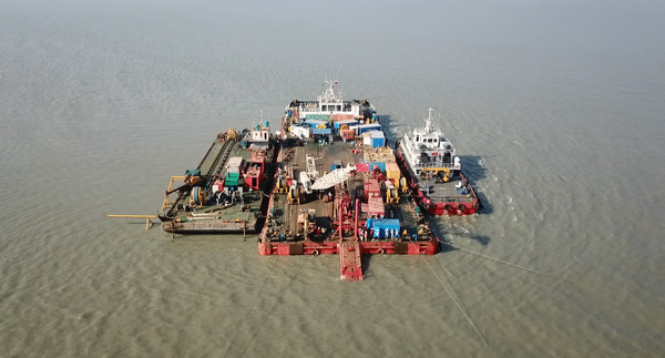 据介绍,孟加拉国单点系泊项目合同任务多元,其中6条输油管道的登陆定向钻穿越(南部4条、北部2条)是关键控制性工程,这其中难度最大的又属南部两条直径914毫米的长距离输油管道穿越。此次成功实施的是南部最后一条登陆定向钻工程,拖拽管道直径914毫米、壁厚31.75毫米、长度1580米,是目前国内企业实施的管径最大、距离最长、难度最高的操作。施工过程还采用了独创的“海上扩孔及拖管工艺”,实施对海定向钻穿越。