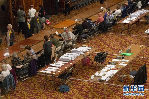 5月26日,在英国南安普敦的一个计票站,工作人员进行计票。新华社发(雷伊·唐 摄)