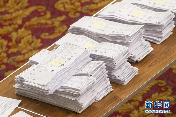这是5月26日在英国南安普敦的一个计票站拍摄的选票。五年一次的欧洲议会选举23日至26日在欧盟28个成员国间举行。选民将选举出751名议员,组成第九届欧洲议会,任期5年。新华社发(雷伊·唐 摄)