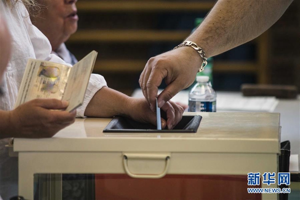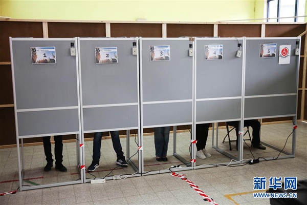 5月26日,在比利时布鲁塞尔,选民在一处投票站准备投票。新华社记者 郑焕松 摄