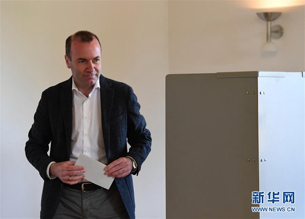 5月26日,在德国维尔登贝格,欧洲人民党欧盟委员会主席候选人曼弗雷德·韦伯在一处投票站准备投票。新华社记者 逯阳 摄