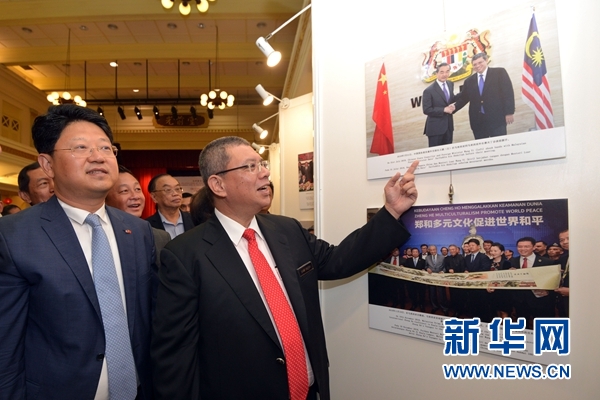 马来西亚外交部长赛夫丁(右)、中国驻马来西亚大使白天(左)等嘉宾欣赏参展照片。张纹综 摄