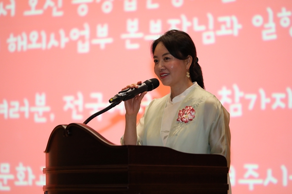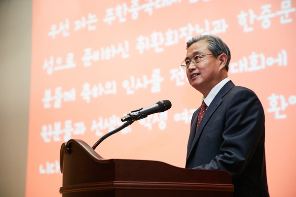 第十五届“龙庆峡杯”中华缘大赛决赛25日在位于首尔的韩国国会“议员会馆”举行。图为韩中文化友好协会会长曲欢致辞。(主办方供图)