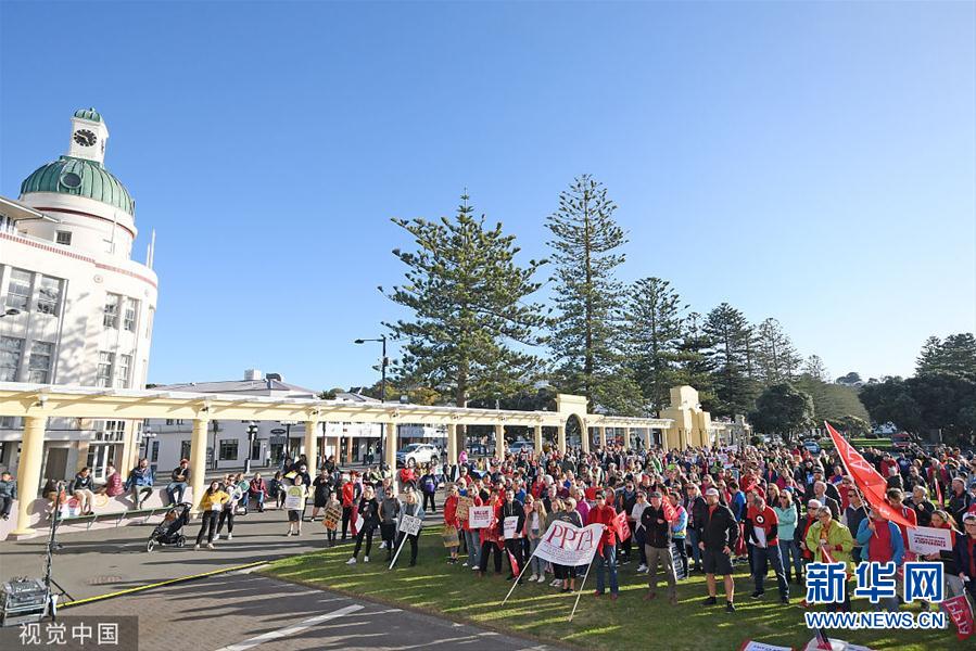 当地时间2019年5月29日,新西兰内皮尔,新西兰全国中小学教师举行大罢工。这次罢工是新西兰教师行业最大规模的联合罢工行动。当天,全国大约5万名教师和校长参加了这次历史性的罢工,预计80万名学生将受到影响。(图片来源:视觉中国)