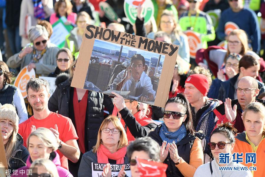 当地时间2019年5月29日,新西兰内皮尔,新西兰全国中小学教师举行大罢工。这次罢工是新西兰教师行业最大规模的联合罢工行动。当天,全国大约5万名教师和校长参加了这次历史性的罢工,预计80万名学生将受到影响。(图片来源:视觉中国)