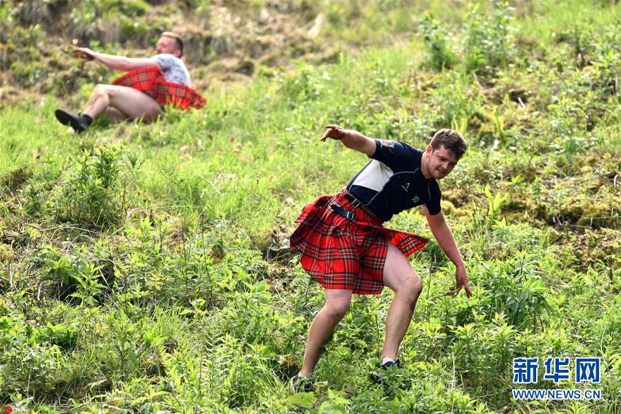 当地时间2019年5月27日,英国格洛斯特郡Brockworth,当地举办一年一度的滚奶酪大赛,参赛者争先恐后从山坡上翻滚而下追逐一块奶酪,甚至有参赛者不惜为此受伤。(图片来源:东方IC)