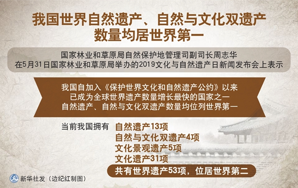 新华社北京5月31日电(记者胡璐)国家林业和草原局自然保护地管理司副司长周志华31日说,我国自加入《保护世界文化和自然遗产公约》以来,已成为全球世界遗产数量增长最快的国家之一,自然遗产、自然与文化双遗产数量均位列世界第一。