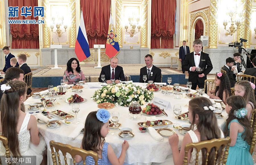 当地时间5月30日,俄罗斯莫斯科,儿童节前夕,俄罗斯总统普京在克里姆林宫宴请来自俄罗斯各地的大家庭,表彰这些家庭的父母,为改善俄罗斯的低生育率作出的贡献。(图片来源:视觉中国)