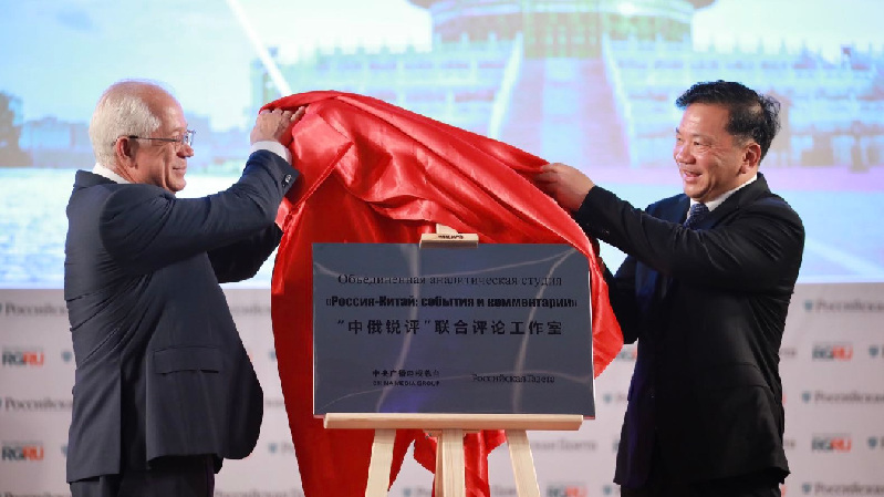 6月5日,由中央广播电视总台与俄罗斯政府机关报《俄罗斯报》共同打造的“中俄锐评”联合评论工作室揭牌仪式在莫斯科举行。中宣部副部长、中央广播电视总台台长慎海雄,俄罗斯报社长涅戈伊察出席仪式,并共同为“中俄锐评”联合评论工作室揭牌。