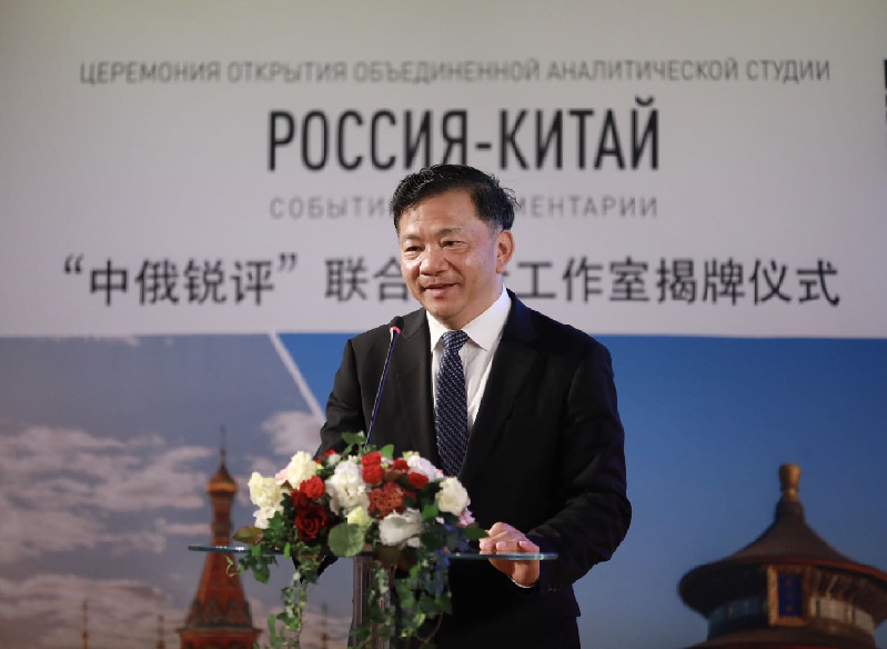 中宣部副部长、中央广播电视总台台长慎海雄和俄罗斯报社长涅戈伊察为“中俄锐评”联合评论工作室揭牌