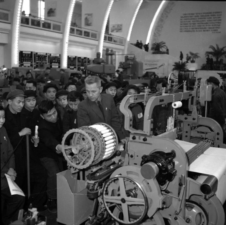 ↑上海,观众在苏联经济及文化建设成就展览会上参观苏联制造的自动织布机.(1955年3月15日,杨溥涛)